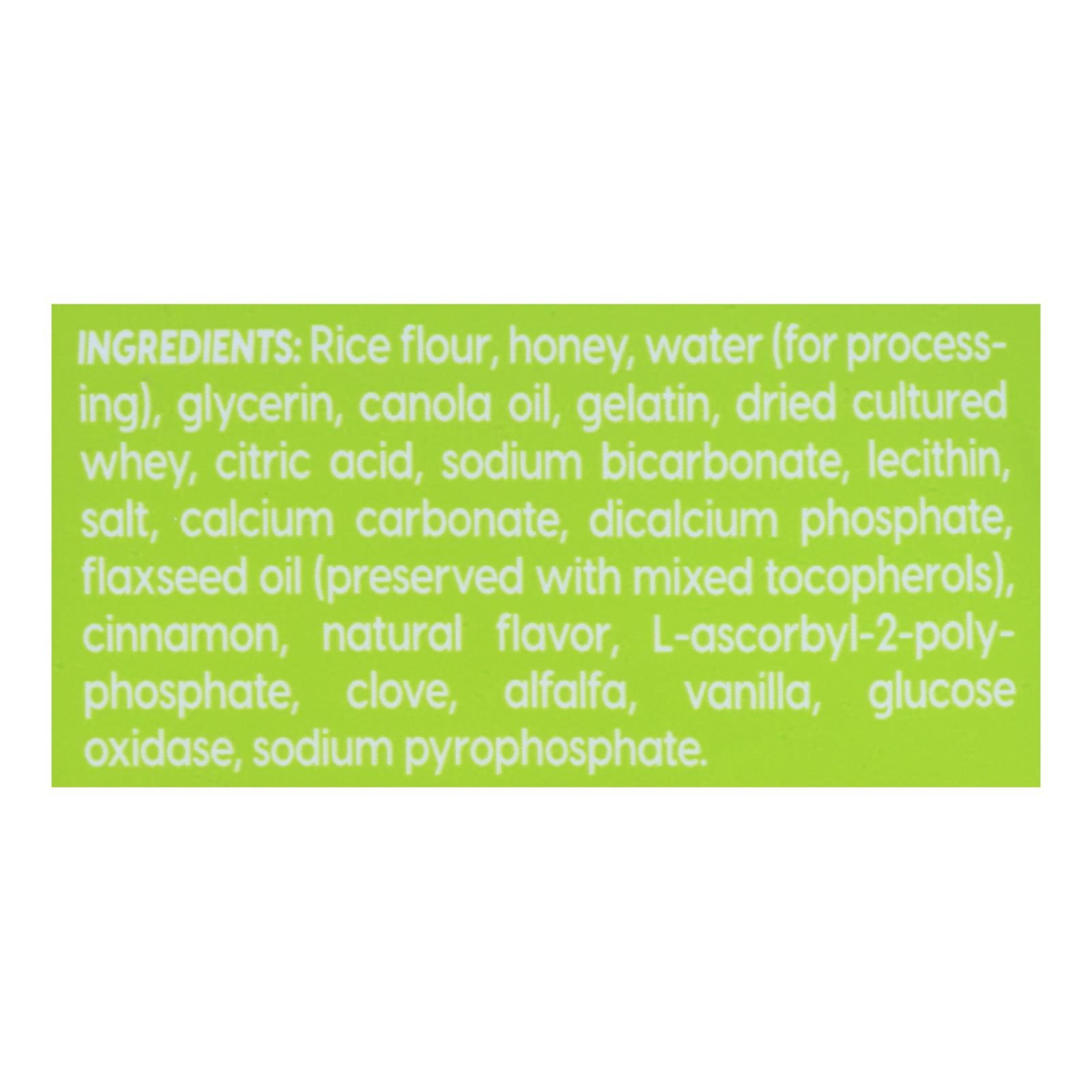 ingredients : rice flour;honey;water;for processing;glycerin;canola oil;gelatin;dried cultured whey;citric acid;sodium bicarbonate;lecithin;salt;calcium carbonate;dicalcium phosphate;flaxseed oil;preserved with mixed tocopherols;cinnamon;natural flavor;l-ascorbyl-2-poly-phosphate;clove;alfalfa;vanilla;glucose oxidase;sodium pyrophosphate