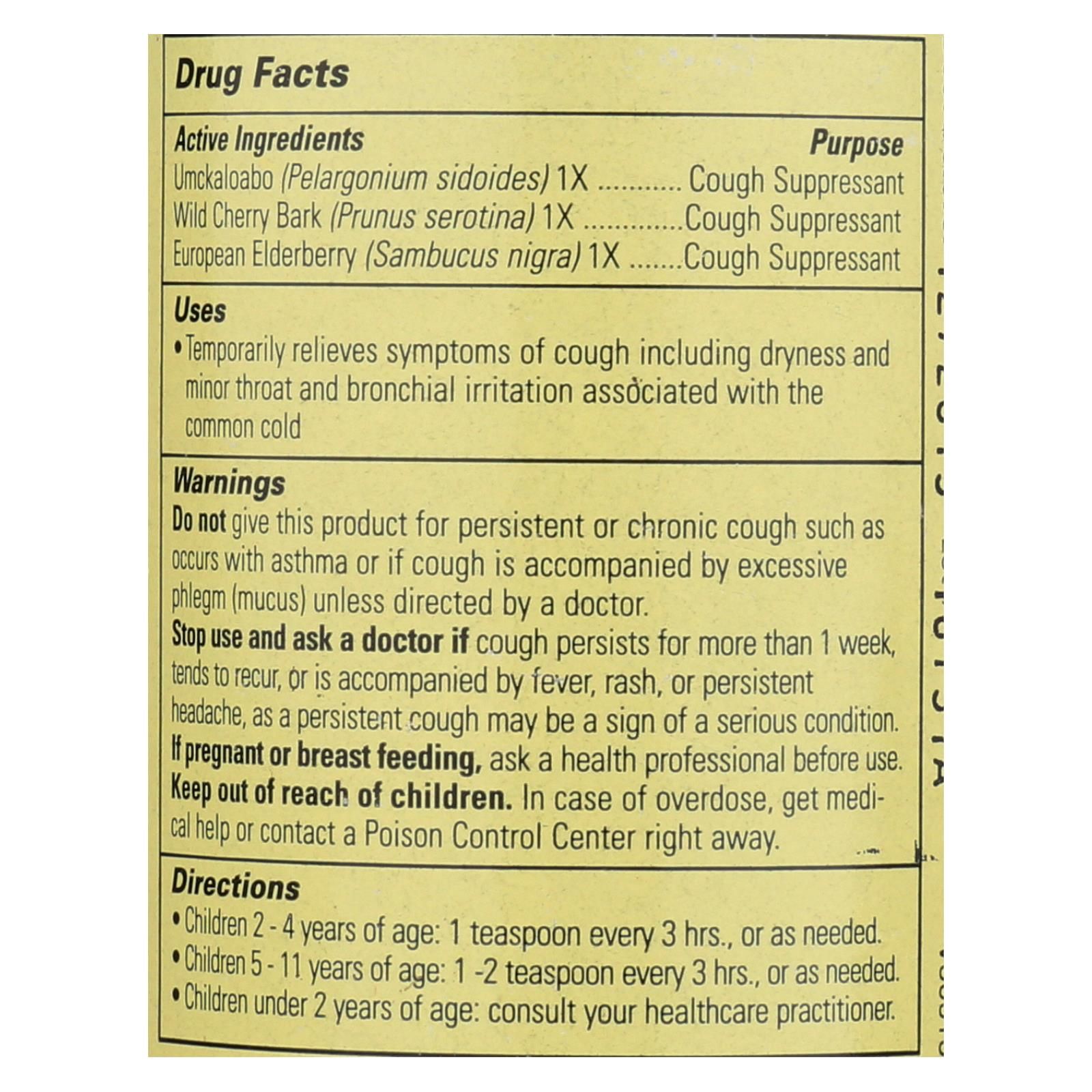 ingredients : drug facts active umckaloabo;pelargonium sidoides;1x purpose cough suppressant wild cherry bark;prunus serotina;1x purpose cough suppressant european elderberry;sambucus nigra;1x purpose cough suppressant;inactive buckwheat honey;elderberry extract;citric acid;usp purified water;natural mixed berry and raspberry flavor;potassium sorbate;stevia;xanthan gum