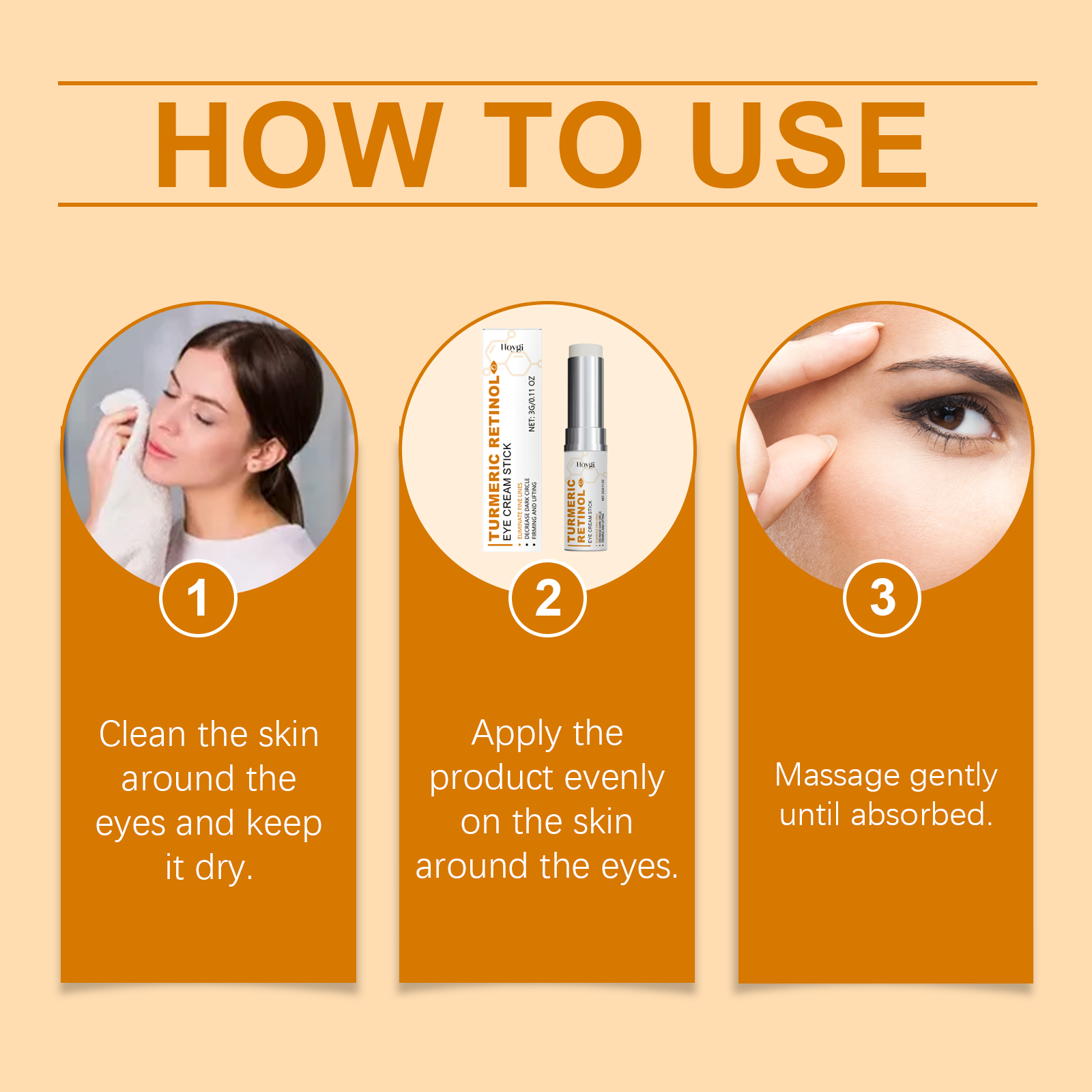 Our retinol eye cream sticks contain aloe vera extract, vitamin E (tocopherol). It deeply moisturizes and helps the skin retain moisture. Its application method is very simple: clean the skin around the eyes, keep dry, evenly apply the product to the skin around the eyes, gently massage until absorbed. It can also strengthen the skin structure and reduce the appearance of aging marks.