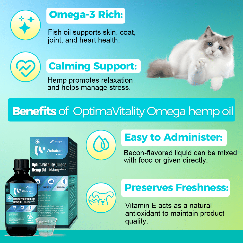 Introducing OptimaVitality Omega & Hemp Oil Blend, a premium liquid supplement designed to enhance the health and vitality of both cats and dogs. This carefully formulated blend combines the benefits of fish oil rich in omega-3 fatty acids and hemp oil known for its calming effects, supporting overall health, skin and coat condition, joint mobility, and heart function. Enhanced with natural bacon flavor, this supplement is highly palatable, making it easy to administer to your pets.