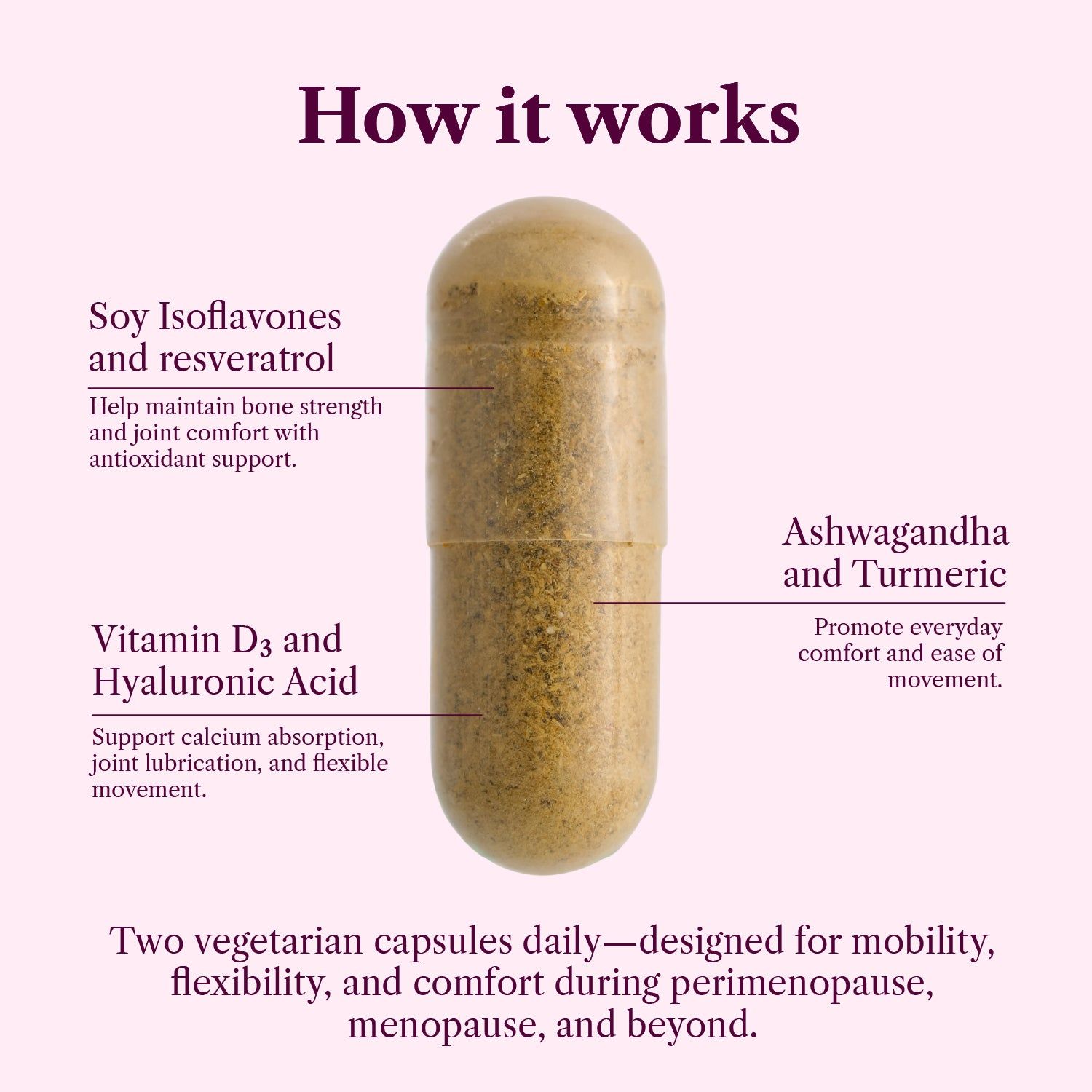Clinically formulated to help support strength, flexibility, and everyday mobility during perimenopause, menopause, and beyond. This non-hormonal blend features resveratrol, hyaluronic acid, turmeric, soy isoflavones, and vitamin D₃ to help maintain joint comfort and overall well-being—supporting an active lifestyle through every stage of life.