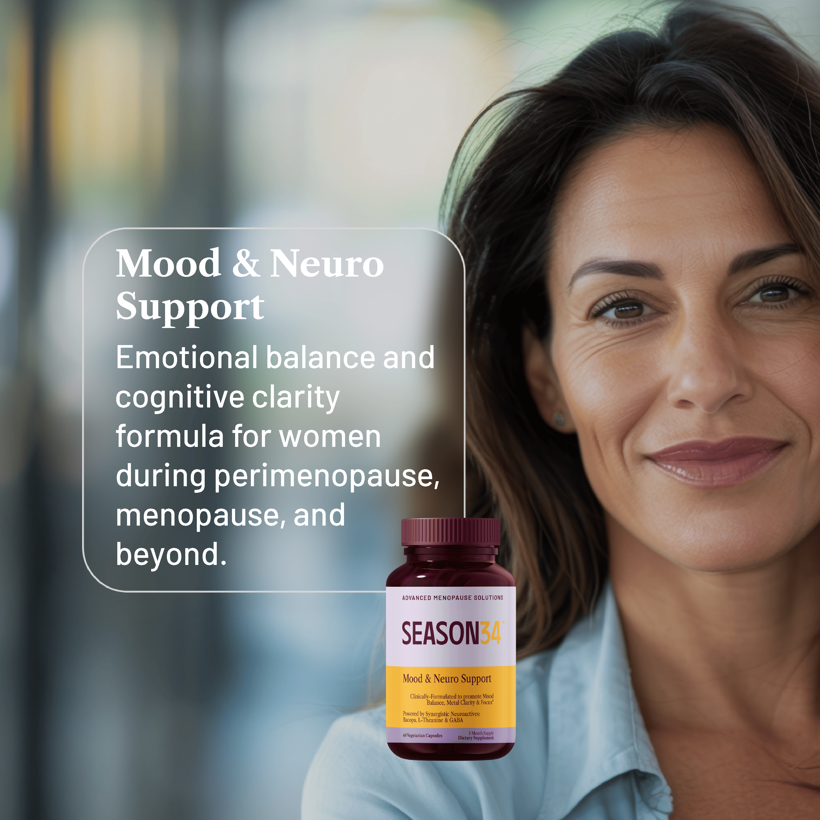 SEASON34 Menopause Mood & Neuro Support is clinically formulated for women navigating brain fog, forgetfulness, mental fatigue, and emotional overwhelm during perimenopause and menopause. As estrogen levels shift, many women notice changes in memory, focus, and mental sharpness — often without warning.