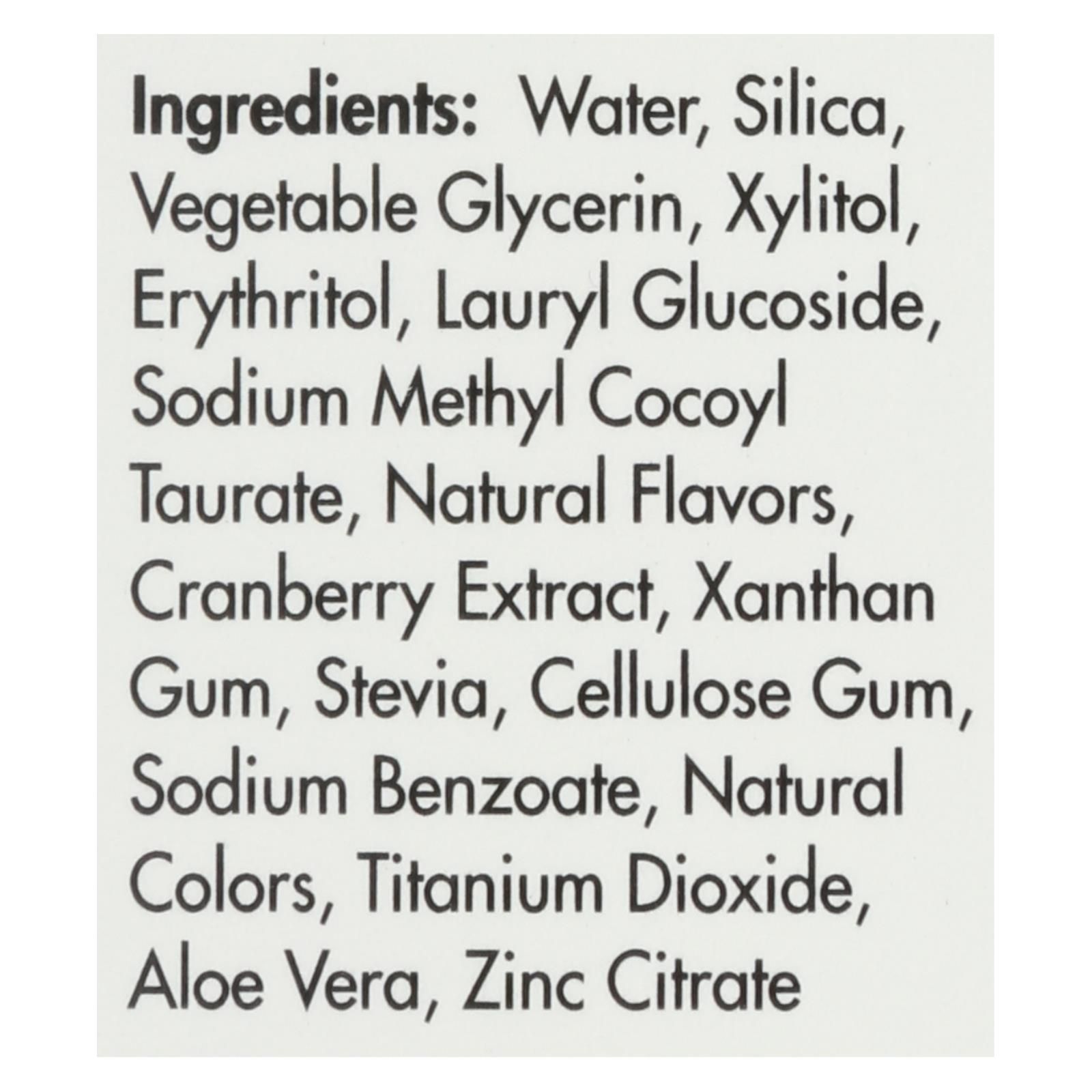 ingredients : water;silica;vegetable glycerin;xylitol;erythritol;lauryl glucoside;sodium methyl cocoyl taurate;natural flavors;cranberry extract;xanthan gum;stevia;cellulose gum;sodium benzoate;natural colors;titanium dioxide;aloe vera;zinc citrate
