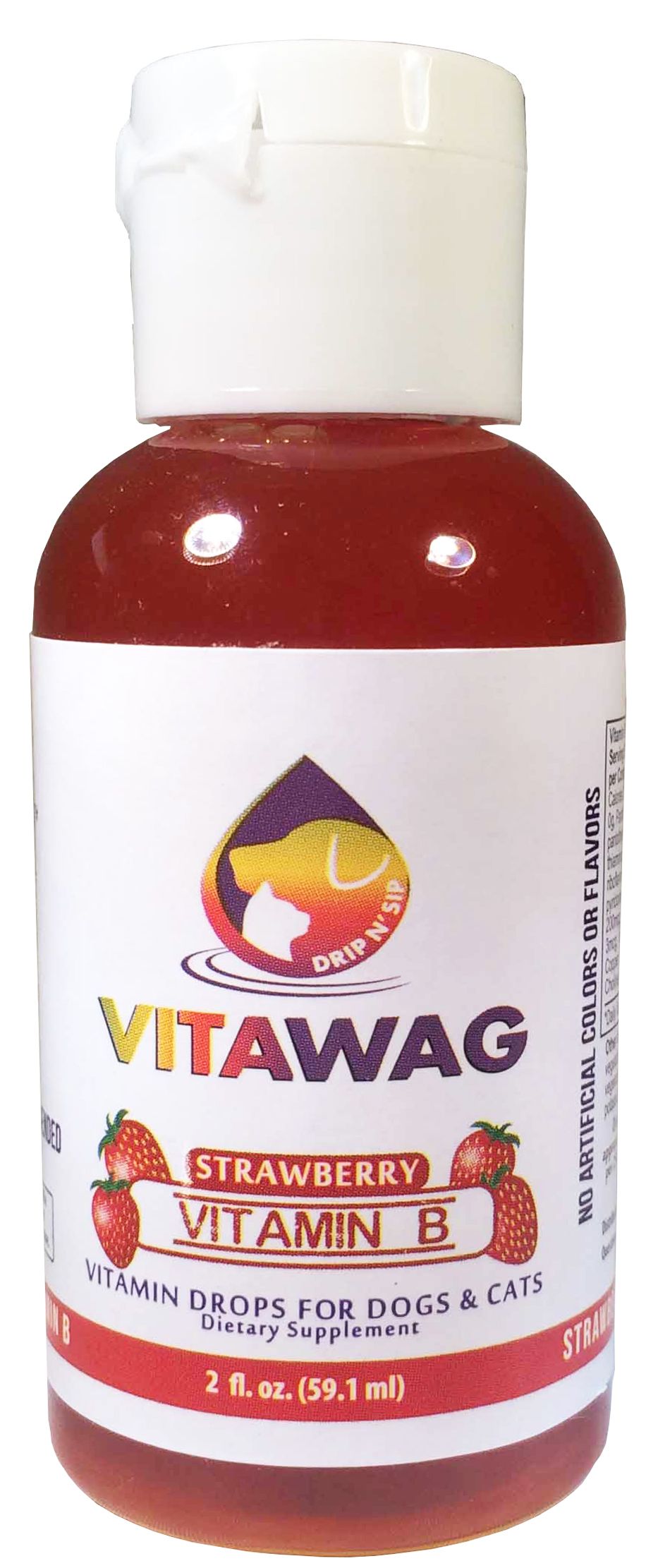 The VITAWAG Super Concentrated Liquid Vitamin Supplements for Dogs and Cats are available in 4 Dog and Cat Loving Flavors, with an average supply of 24 Days per 2 Ounce bottle. All ingredients are composed of 100% All Natural and Non-Artificial Flavors with No Added Dyes or Chemicals with No added Preservatives. The All Natural Ingredients supplied in each of our formulas offer many beneficial properties. The Mint Electrolyte Formula offers Proper Hydration, Easing Arthritis, Soothing of the Stomach and aiding in Digestive Support, while promoting proper Coat Health and providing Fresh Breath. The Strawberry Vitamin B Formula offers assistance in Muscle Development and Skin, Coat and Eye Health while offering Anti-inflammatory benefits and helping aid in proper healthy Red Blood Cell development for pets in recovery. The Banana Potassium Formula Helps Prevent Stones, Weakening of Bones, Irregular Heart Beat, High Blood Pressure, while aiding in Nerve Cell Support and Helping Neutralize proper PH levels in the body. The Blueberry Anti-Oxidant Formula Helps Promote Healing, Immune and Digestive Support, and Helping protect against Free Radicals within the body in addition to eye Health for aging pets. See Ingredients for further details. MINT ELECTROLYTE LIQUID SUPPLEMENT FACTS: Serving Size: 1/2 tbs (2.5 ml), Servings per Container: 24, Amount per Serving: Calories 2, Total Carbohydrates 0.5g, Sugars 0g, Peppermint Extract 100mg, Chamomile Extract 175mg, Fennel Extract 50mg. Other Ingredients: coconut water, vegetable glycerin, natural mint flavor, natural green pigment, stevia extract, citric acid, potassium sorbate, sodium benzoate. STRAWBERRY VITAMIN B LIQUID SUPPLEMENT FACTS: Serving Size: 1/2 tbs (2.5 ml), Servings per Container: 24, Amount per Serving: Calories 2, Total Carbohydrates 0.5g, Sugars 0g, Pantothenic Acid (D-calcium pantothenate) 5mg, Vitamin B-1 (as thiamine HCI) .75mg, Vitamin B-2 (as riboflavin) 0.85mg, Vitamin B-6 (as pyridoxine HCI) 1mg, Folate (as folic acid) 200mcg, Vitamin B-12 (cyanobalamin) 3mcg, Iron (as iron gluconate) 0.5mg, Copper (as copper gluconate) 0.5mg, Choline (as choline birartrate) 5m. Other Ingredients: purified water, vegetable glycerin, natural strawberry flavor, vegetable extract, stevia extract, citric acid, potassium sorbate, sodium benzoate. BANANA POTASSIUM LIQUID SUPPLEMENT FACTS: Serving Size: 1/2 tbs (2.5 ml), Servings per Container: 24, Amount per Serving: Calories 2, Total Carbohydrates 0.5g, Sugars 0g, Potassium (as potassium citrate) 50mg, Zinc (as zinc glucanate) 25mg. Other Ingredients: purified water, vegetable glycerin, natural banana flavor, turmeric oleoresin, stevia extract, citric acid, potassium sorbate, sodium benzoate. BLUEBERRY ANTI-OXIDANT LIQUID SUPPLEMENT FACTS: Serving Size: 1/2 tbs (2.5 ml), Servings per Container: 24, Amount per Serving: Calories 12, Total Carbohydrates 3g, Sugars 0g, Vitamin C (as ascorbic acid) 50mg, Vitamin E (as d-alpha tocopheryl acetate) 30IU, Wheat Grass Powder 50mg, Astralagus Powder 25mg, N-Acetyl-L-Cysteine 12.5 mg, Green Tea Extract 12.5 mg, Alpha Lipotic Acid 5mg, Co-Q10 1mg. Other Ingredients: purified water, vegetable glycerin, natural blueberry, red cabbage juice, stevia extract, potassium sorbate, sodium benzoate. Directions and Serving Instructions: Serving Size: 1/2 tbs (2.5 ml), Servings per Container: 24. Simply drop half of a tablespoon into water or food once per day.